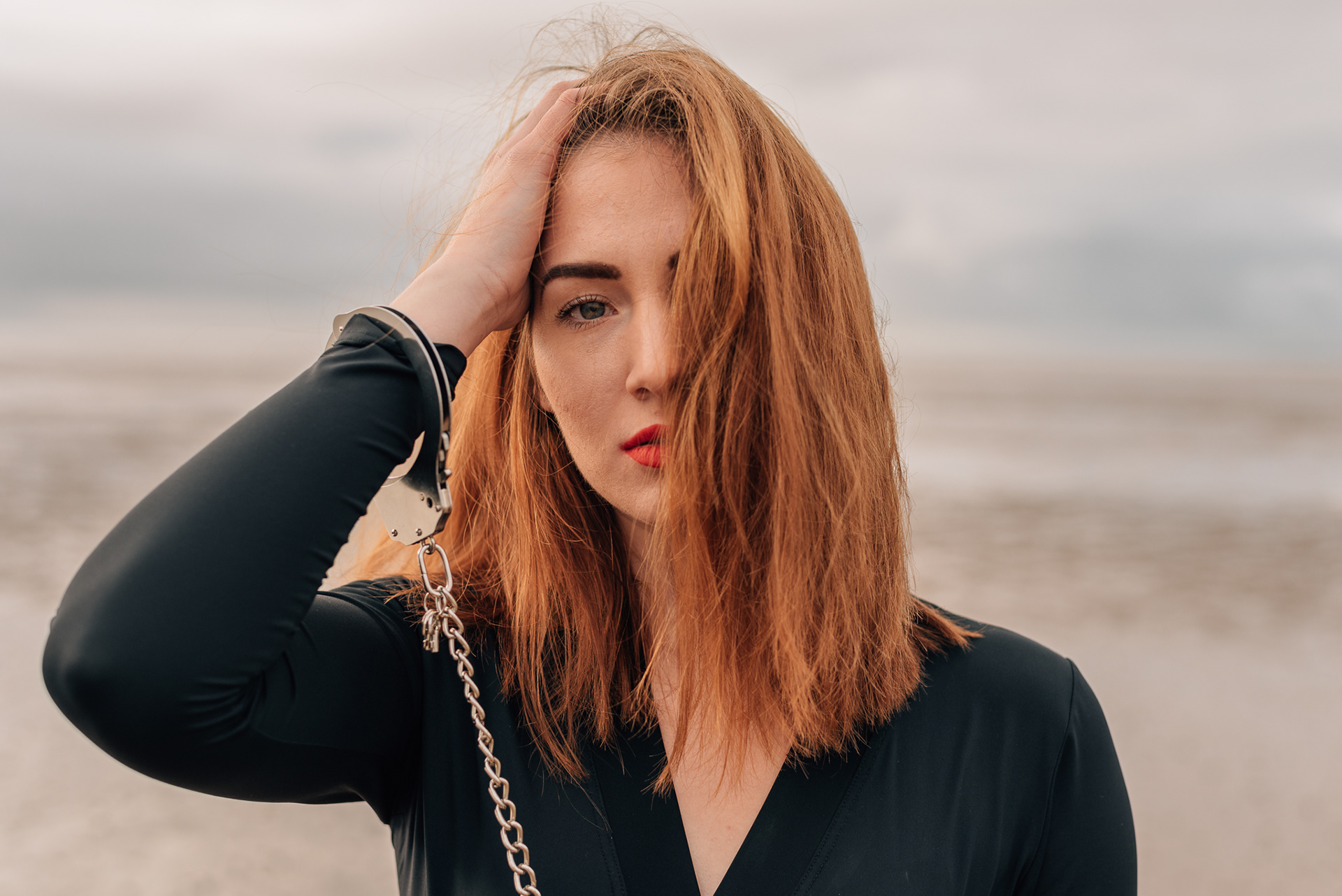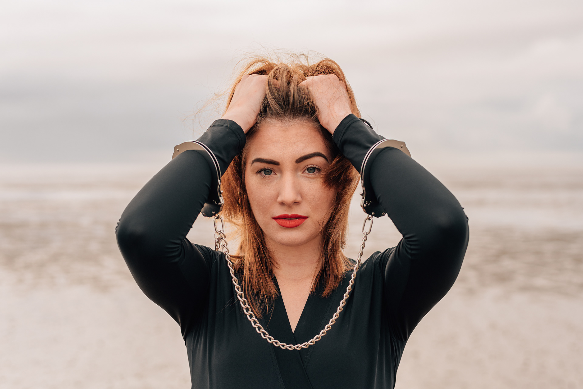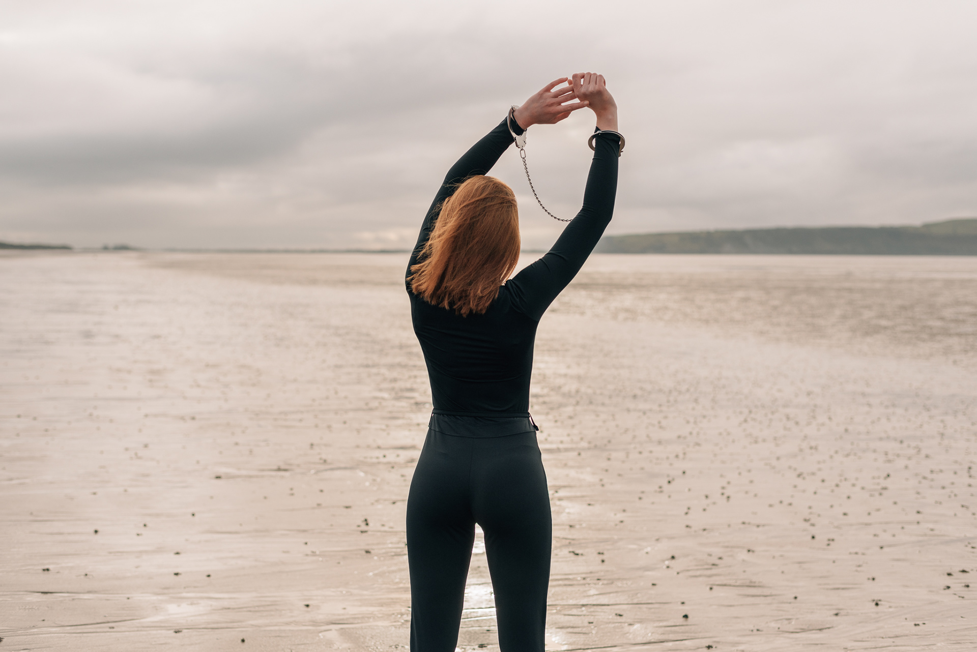 A girl with handcuffs on her wrists.