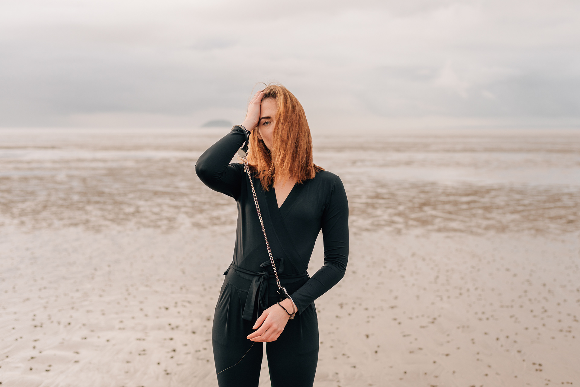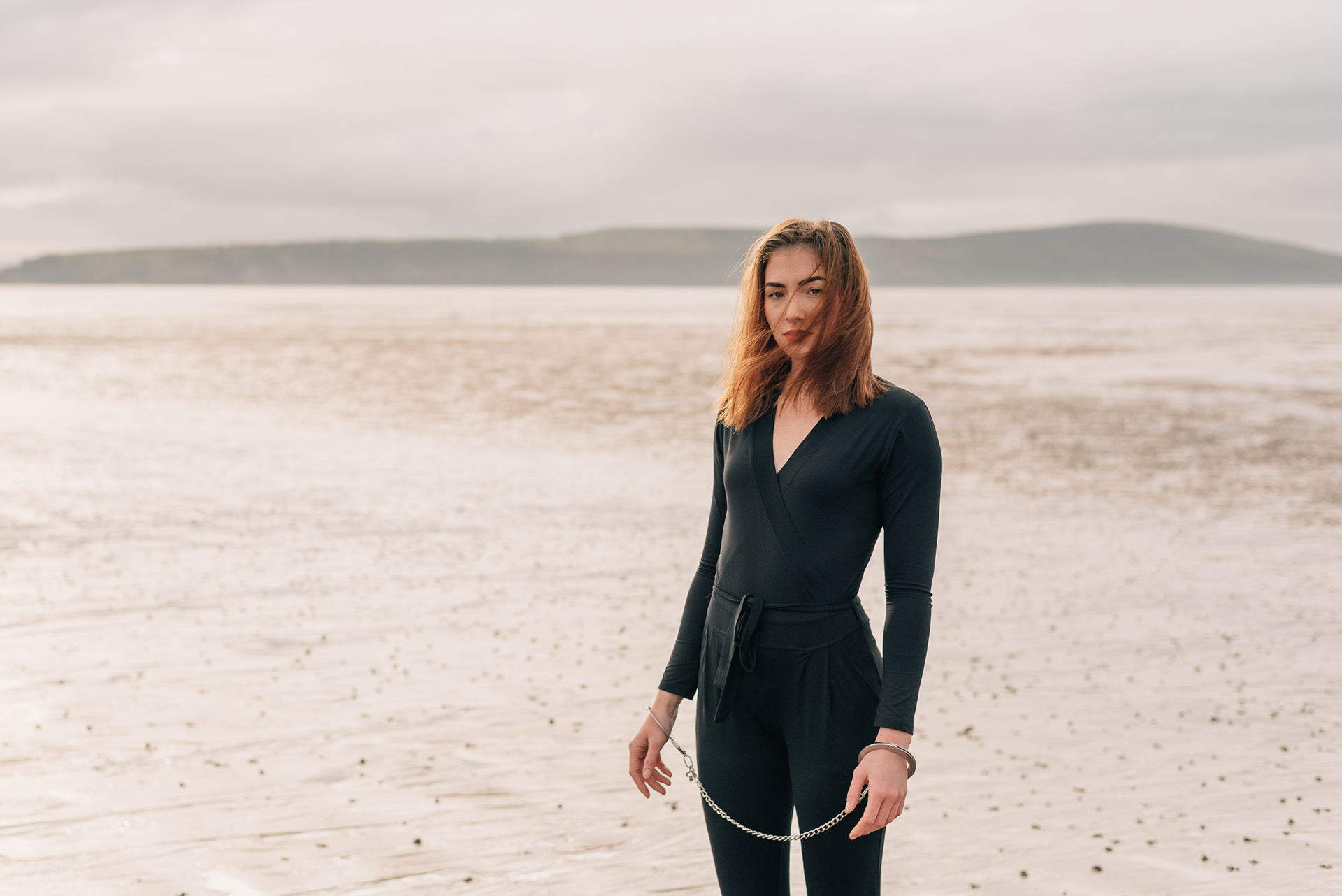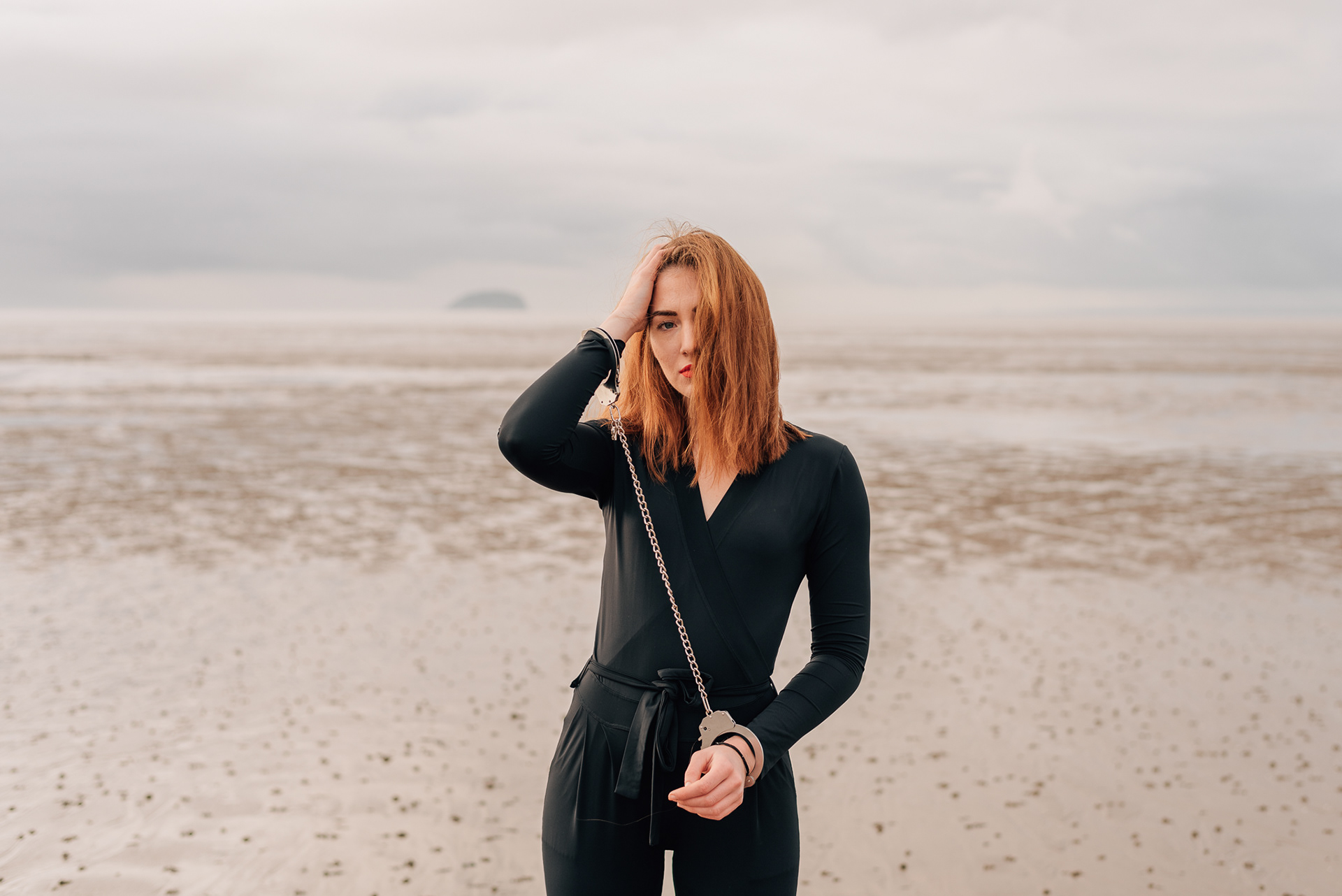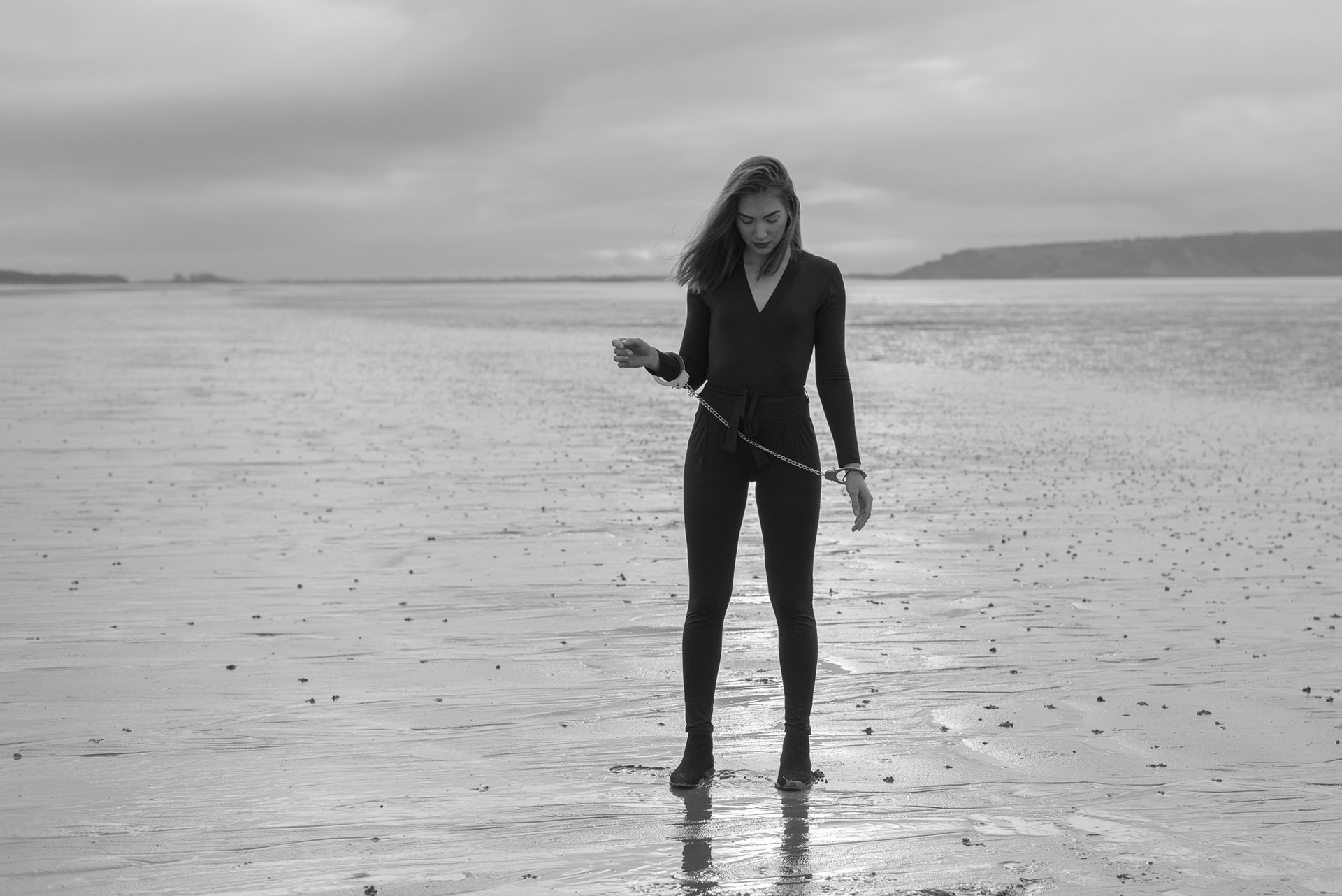 A girl with handcuffs on her wrists.